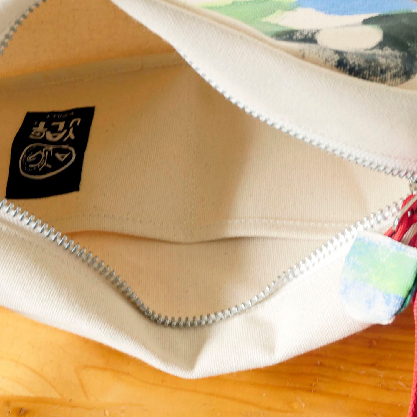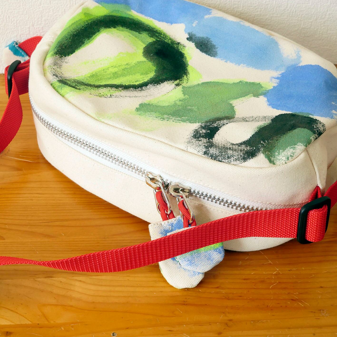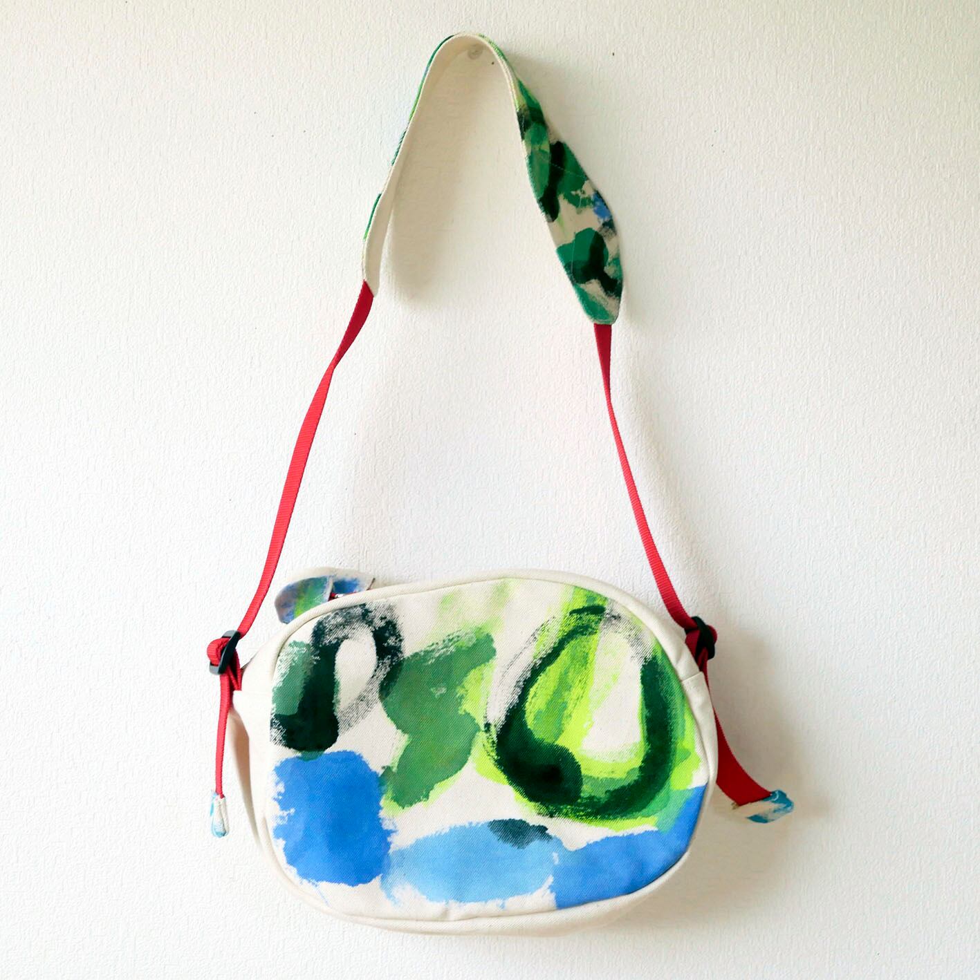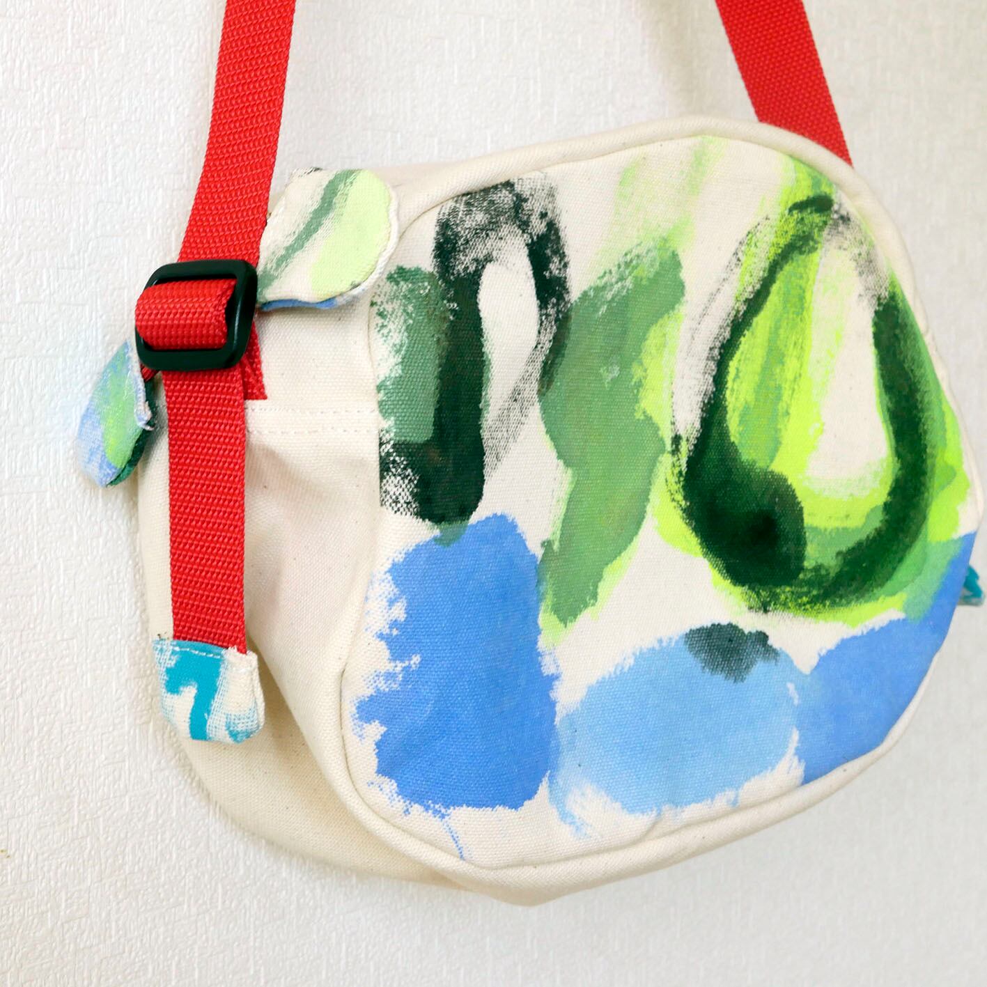 生地に直接アクリル絵の具で描いているため、他にはない一点ものであるとともに、絵の具部分は色移りする可能性がありますのでお気をつけ下さい。