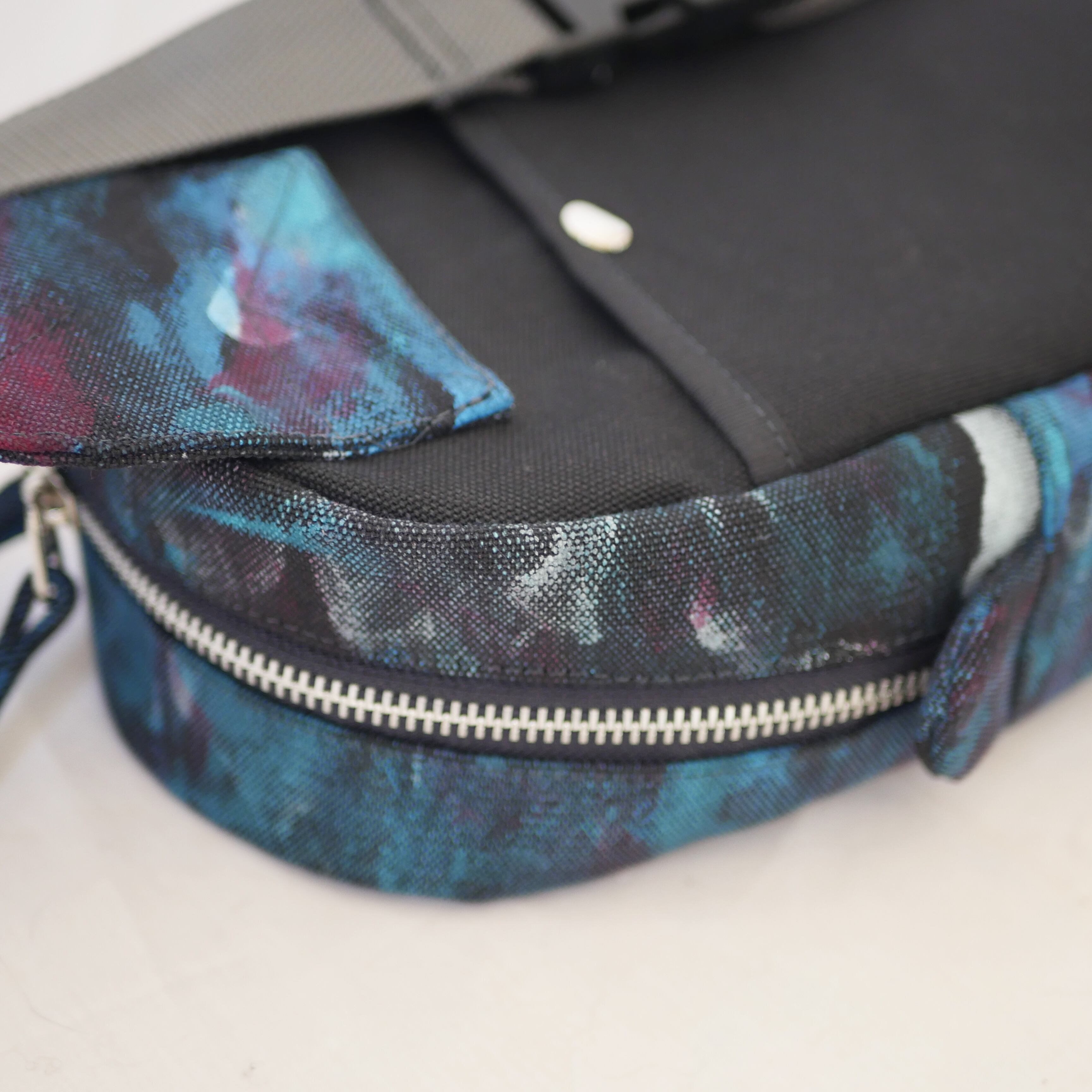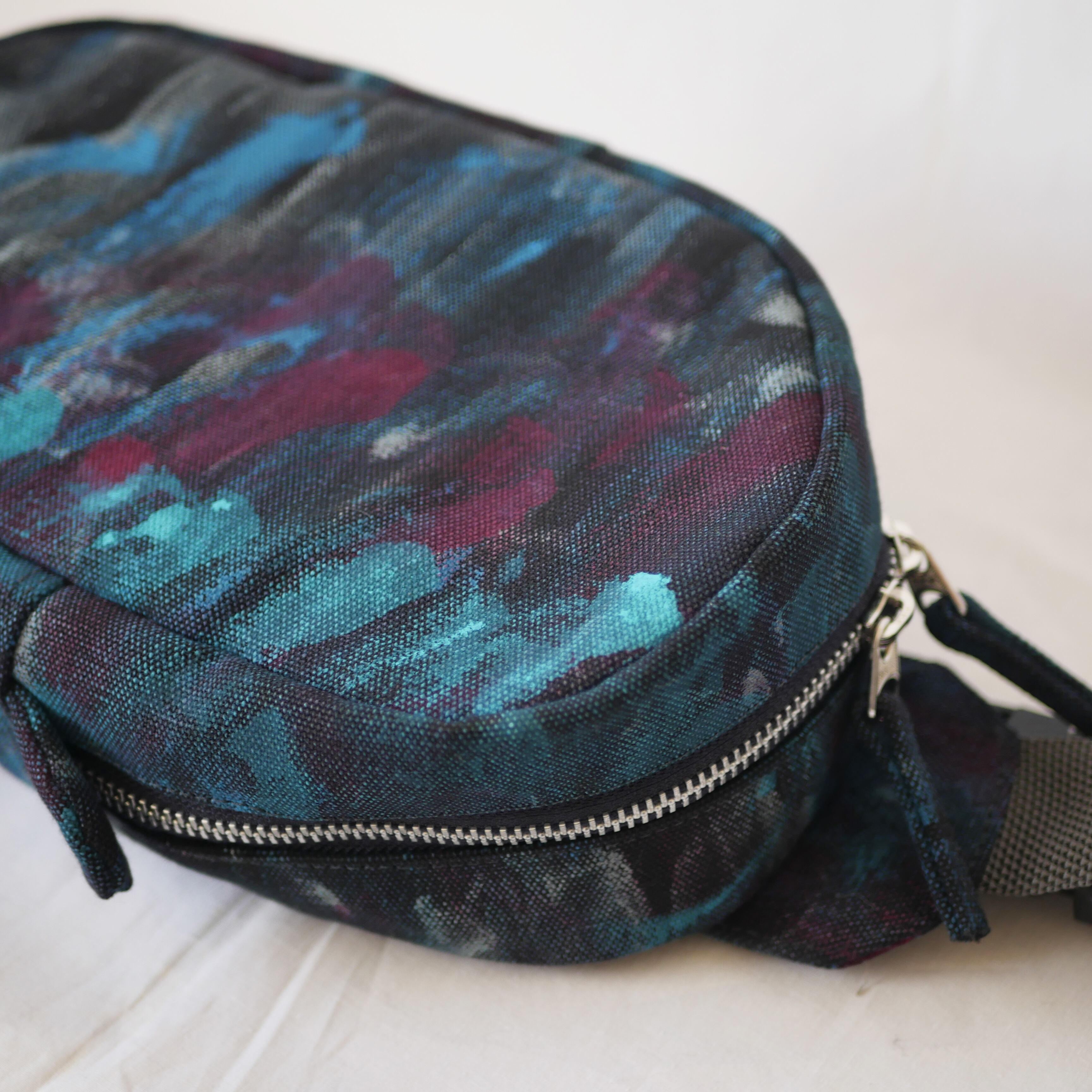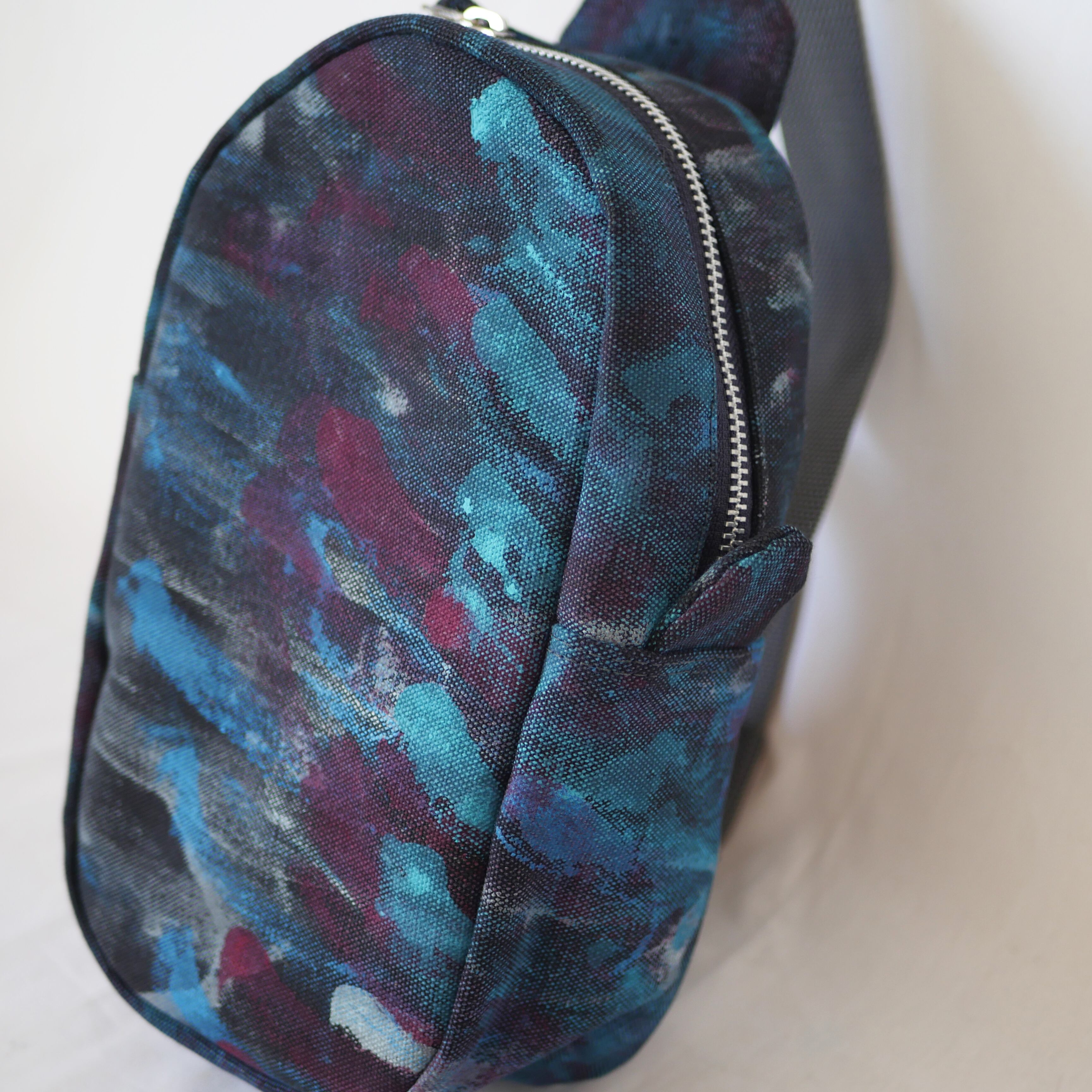 生地に直接アクリル絵の具で描いているため、他にはない一点ものであるとともに、絵の具部分は色移りする可能性がありますのでお気をつけ下さい。