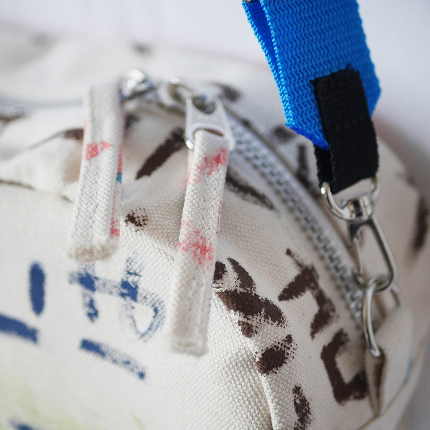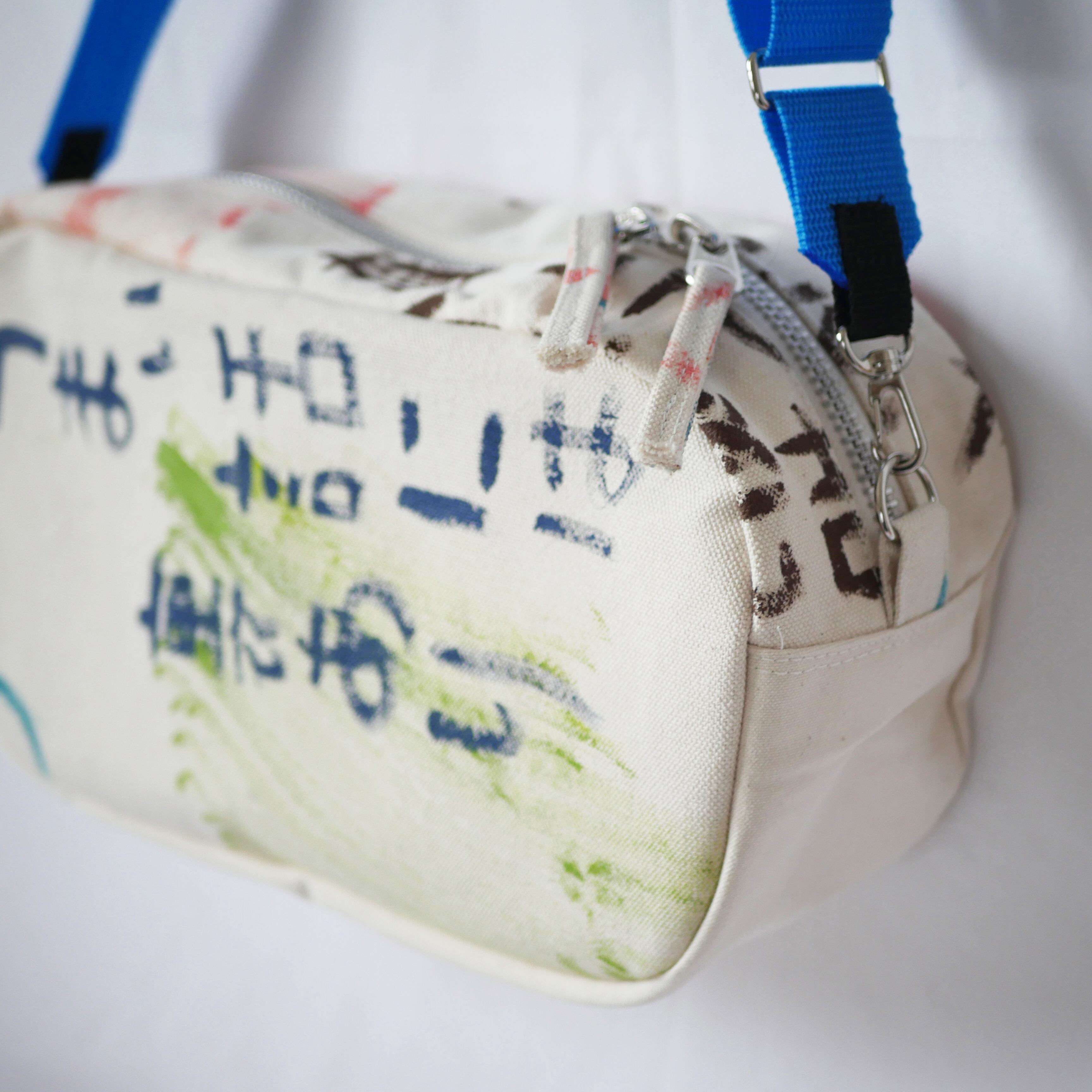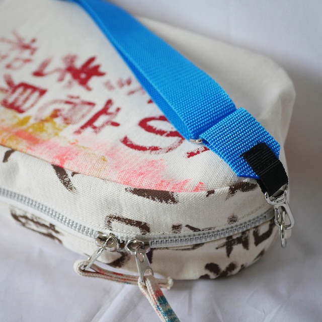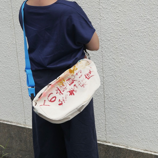 生地に直接アクリル絵の具で描いているため、他にはない一点ものであるとともに、絵の具部分は色移りする可能性がありますのでお気をつけ下さい。
