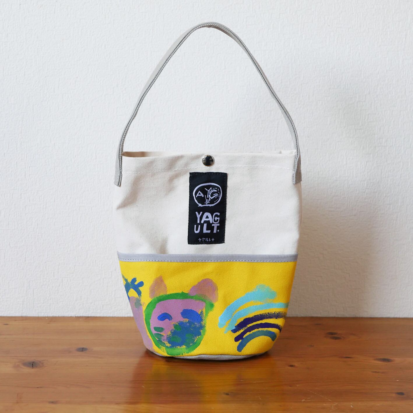 アートと縫製の仕事の隙間に一人で始めたハンドメイドのバッグブランド、YAGULTのニューライン。美術の活動で通っている福祉施設の方々に布に直接絵を描いて貰って、その絵に合わせてフリーハンドで裁断、縫製。感覚的に一点物のバッグを作るプロジェクト。
