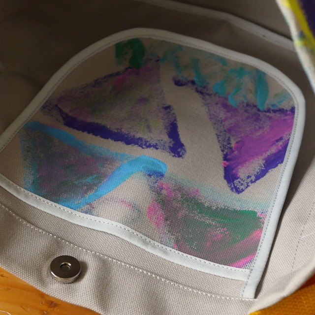 生地に直接アクリル絵の具で描いているため、他にはない一点ものであるとともに、絵の具部分は色移りする可能性がありますのでお気をつけ下さい。