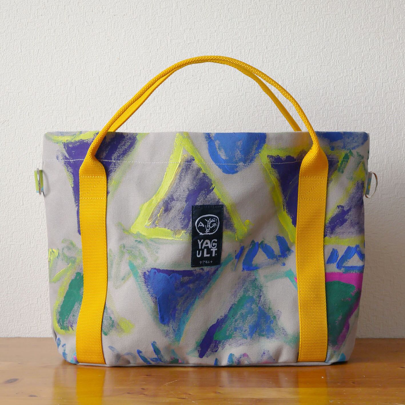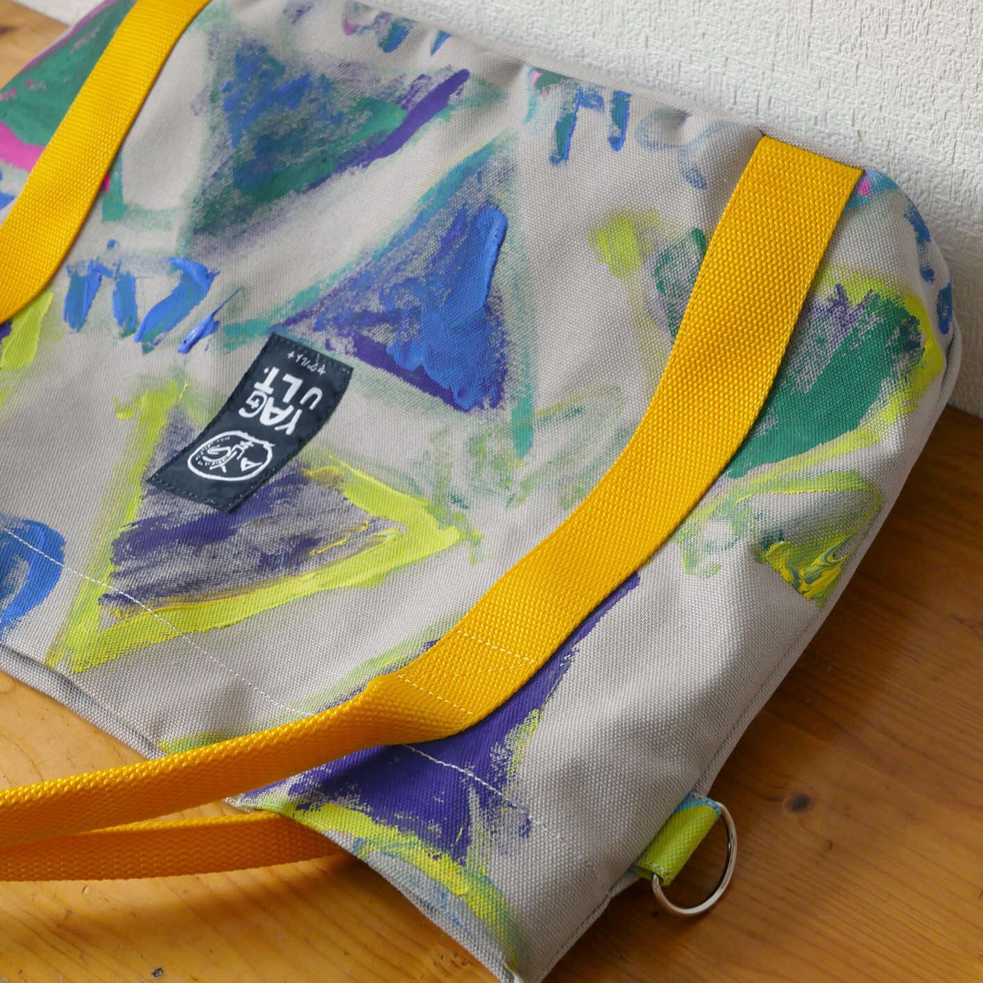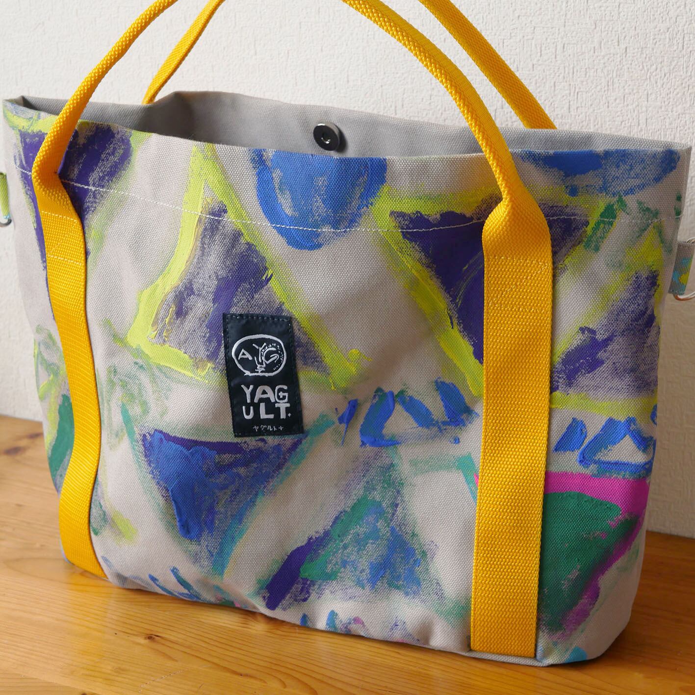 アートと縫製の仕事の隙間に一人で始めたハンドメイドのバッグブランド、YAGULTのニューライン。美術の活動で通っている福祉施設の方々に布に直接絵を描いて貰って、その絵に合わせてフリーハンドで裁断、縫製。感覚的に一点物のバッグを作るプロジェクト。