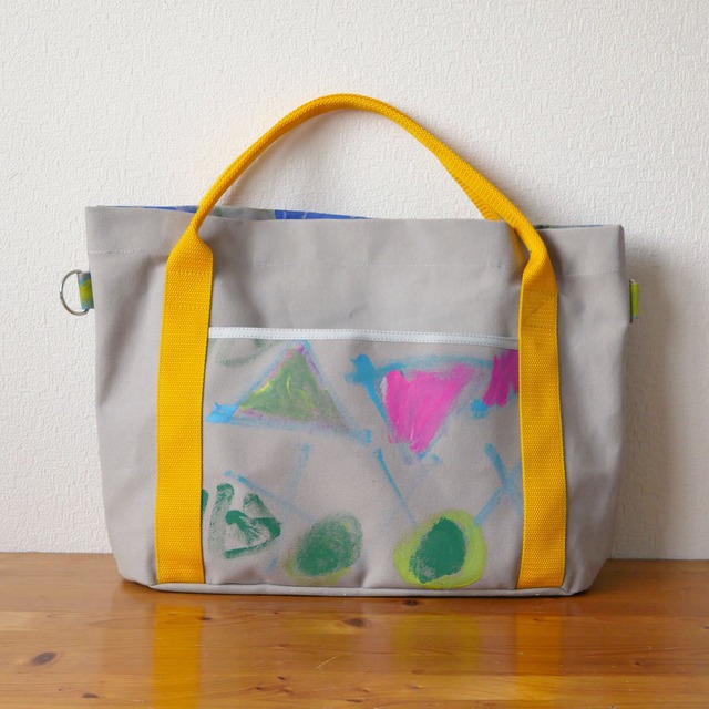 カラー グレーにアクリル絵の具、ショルダー、持ち手黄色PPテープ